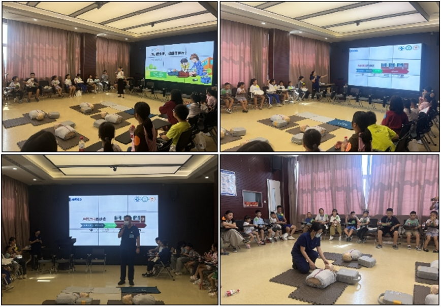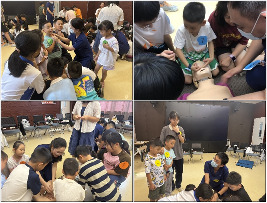 参加活动的孩子们分成4组,由心内科汤晓强医生和内科邓嘉玉医生一起为孩子们进行示教和“手把手”指导。