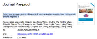稿件来源:91在线 发布时间:2025-03-24 11:54:392025年2月,91在线 张政教授团队联合厦门大学等研究团队在 Clinical Microbiology and Infection发表了题为Safety and immunogenicity of hepatitis E vaccine in compensated liver cirrhosis with chronic hepatitis B的原创研究论文,该临床研究填补了针对肝硬化人群接种戊肝疫苗安全性与免疫应答评估的空白。据悉,该研究被《Clinical Microbiology and Infection》(IF:10.9)接收后,便获得了极高关注,并被纳入欧洲ESGVH-ESCMID发布的《全球戊型肝炎疫苗接种立场文件》中。