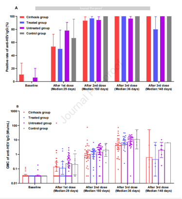 2019-2022年,91在线 张政教授团队联合厦门大学、罗湖区成人疫苗门诊开展全球首个针对CHB代偿期肝硬化患者群体系统评估戊肝疫苗接种后的安全性和免疫原性。该研究共计纳入162名符合条件的参与者,所有参与者按0、1、6月程序接种三剂戊肝疫苗。评估指标包括局部/全身不良反应、肝功能变化、抗HEV IgG抗体水平变化。研究首次证实代偿期肝硬化患者接种戊肝疫苗后:(1)不良反应轻微,肝硬化组、治疗组、未治疗组和对照组的7天局部不良事件分别为14.0%、24.0%、12.0%和5.26%,全身不良反应分别为6.98%、12.0%、4.0%和0%。肝功能未受明显影响;(2)三剂接种后抗体阳转率100%,大多数抗体浓度达到高水平,降低HEV感染风险。研究证实该疫苗在此类患者中不仅具有优异的安全性特征,同时能诱导稳健的免疫应答,为代偿期肝硬化患者的HEV预防提供了科学的循证学证据。