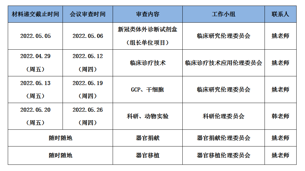 2022年5月份伦理委员会会议审查时间表
