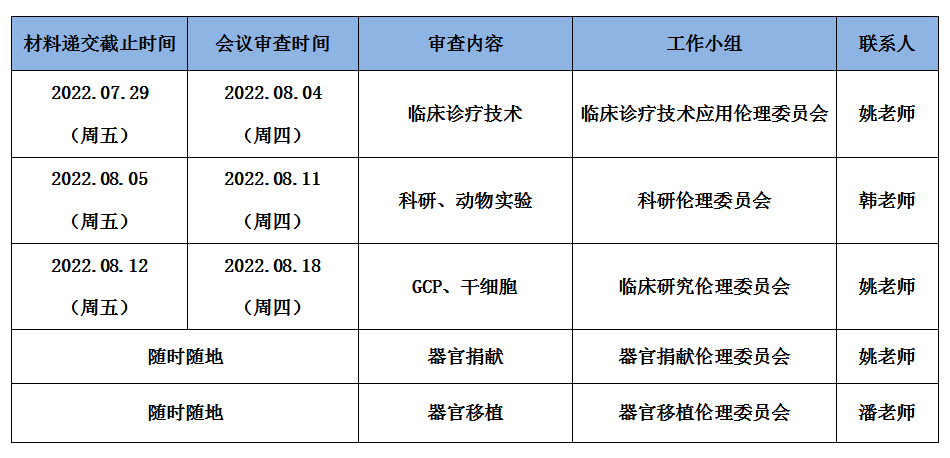 稿件来源:91在线 发布时间:2022-06-30 08:32:572022年8月份伦理委员会会议审查时间表