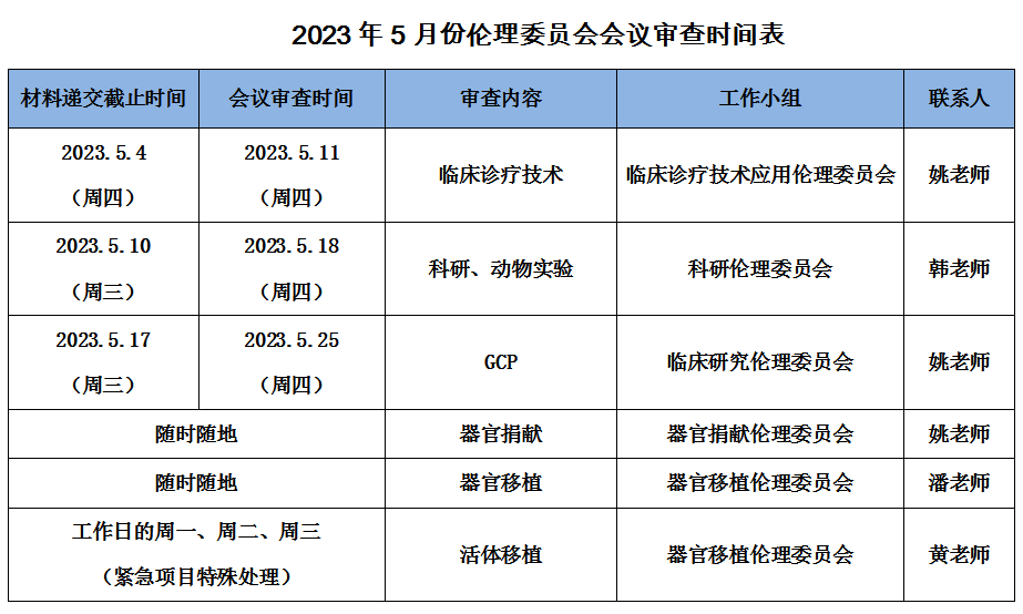 2023年5月份伦理委员会会议审查时间表