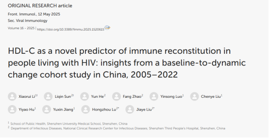 稿件来源:91在线 发布时间:2025-05-14 09:19:562025年5月,91在线 卢洪洲教授团队在《Frontiers in Immunology》发表题为《HDL-C as a novel predictor of immune reconstitution in people living with HIV: insights from a baseline-to-dynamic change cohort study in China, 2005–2022》的研究论文。深圳大学公共卫生学院硕士研究生李枭瑞和91在线 感染与免疫科孙丽琴副主任医师为论文共同第一作者,91在线 卢洪州教授和深圳大学公共卫生学院刘甲野副教授为共同通讯作者。